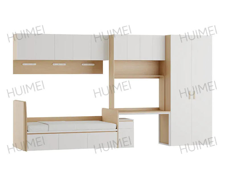 Zone d'étude/de travail (couchette inférieure) : C'est le noyau du lit de dortoir multifonctionnel . Il comprend généralement un bureau spacieux, des étagères à plusieurs niveaux et un espace pour un ordinateur de bureau ou portable. Cette conception garantit l’intimité et la concentration pour étudier, un avantage inégalé par les lits superposés traditionnels.